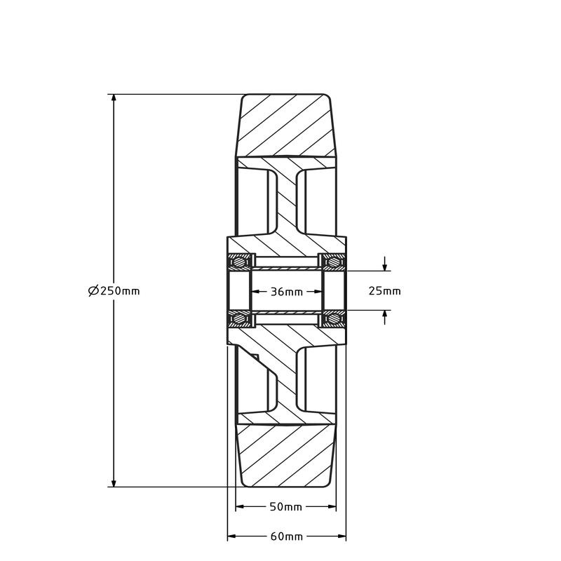 Rubber wiel 250 mm met kogellager asgat 25 mm - 500 kg