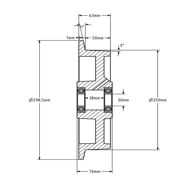 Flenswielen van gietijzer (GG) voorzien van kogellagers.