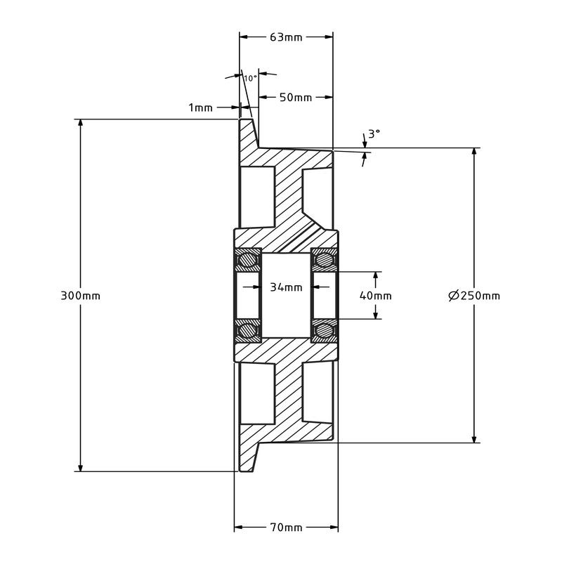 Gietijzer flenswiel 250 mm met kogellager asgat 40 mm - 3000 kg