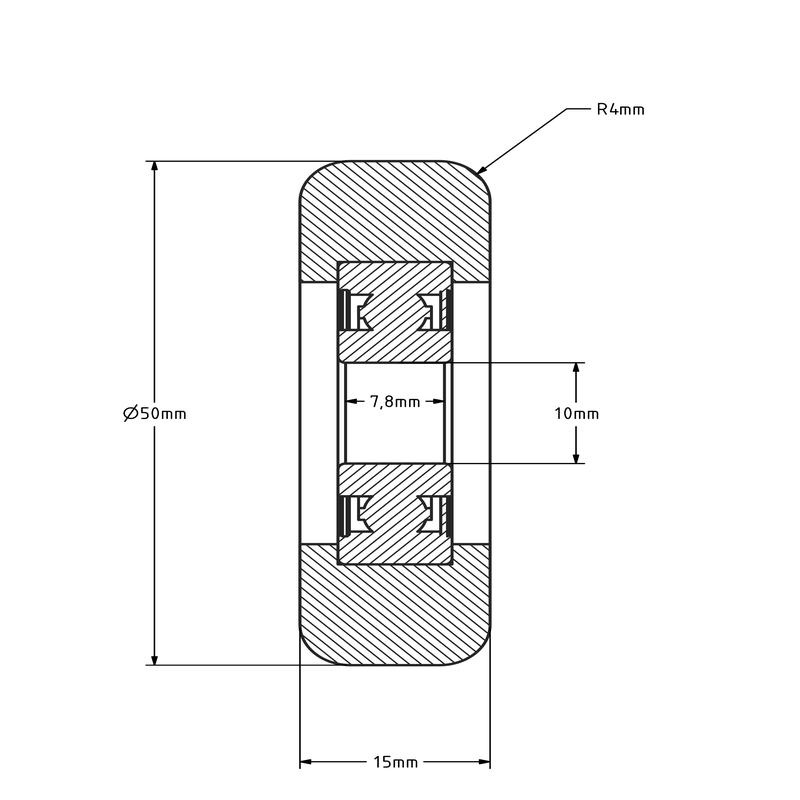 Nylon geleiderol 50x15 mm met kogellager asgat 10 mm - 80 kg