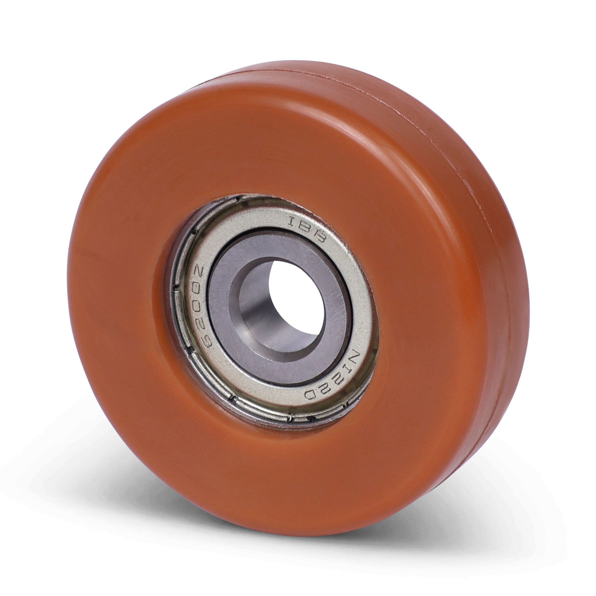 Geleiderollen met een geïnjecteerde polyurethaan band (ca 95 Shore) en 1 kogellager. (RVS lagers mogelijk op aanvraag)