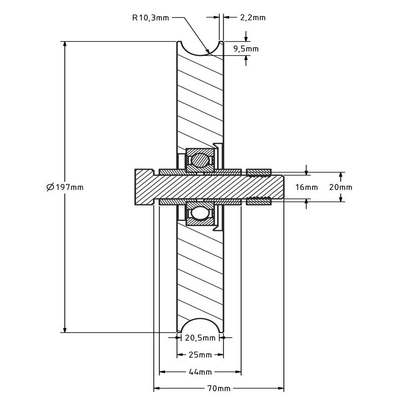 Gelagerd groefwiel 197 mm staal met u groef - 330 kg (kabelschijf)