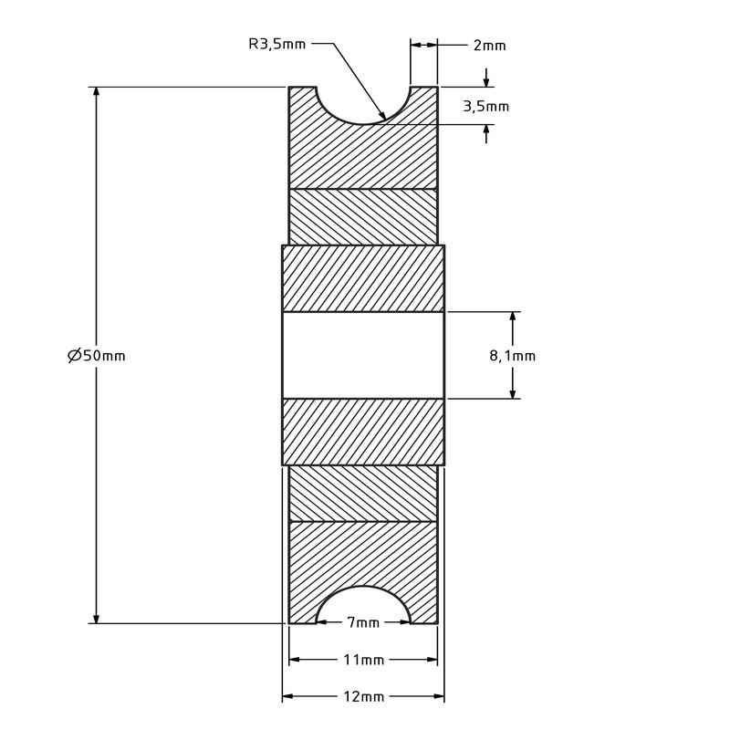 Groefwiel 50 mm staal met ronde groef voor kabel 7 mm
