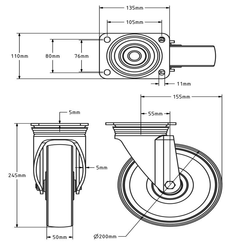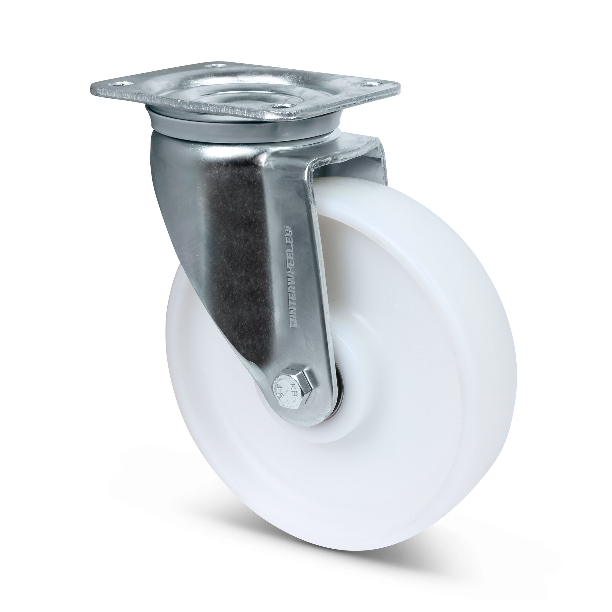 Nylon zwenkwiel 200 mm met kogellager en plaat tot 800 kg