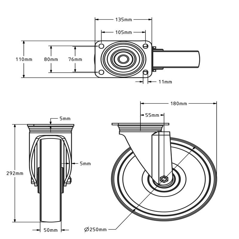 Nylon zwenkwiel 250 mm met kogellager en plaat tot 1200 kg