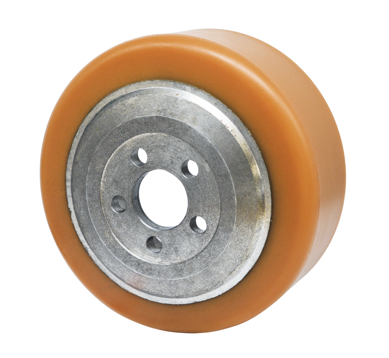 Aandrijfwielen met een Polyurethaan bandage (ca 92 Shore A), gevulkaniseerd op een gietijzerenvelg met flensaansluiting.