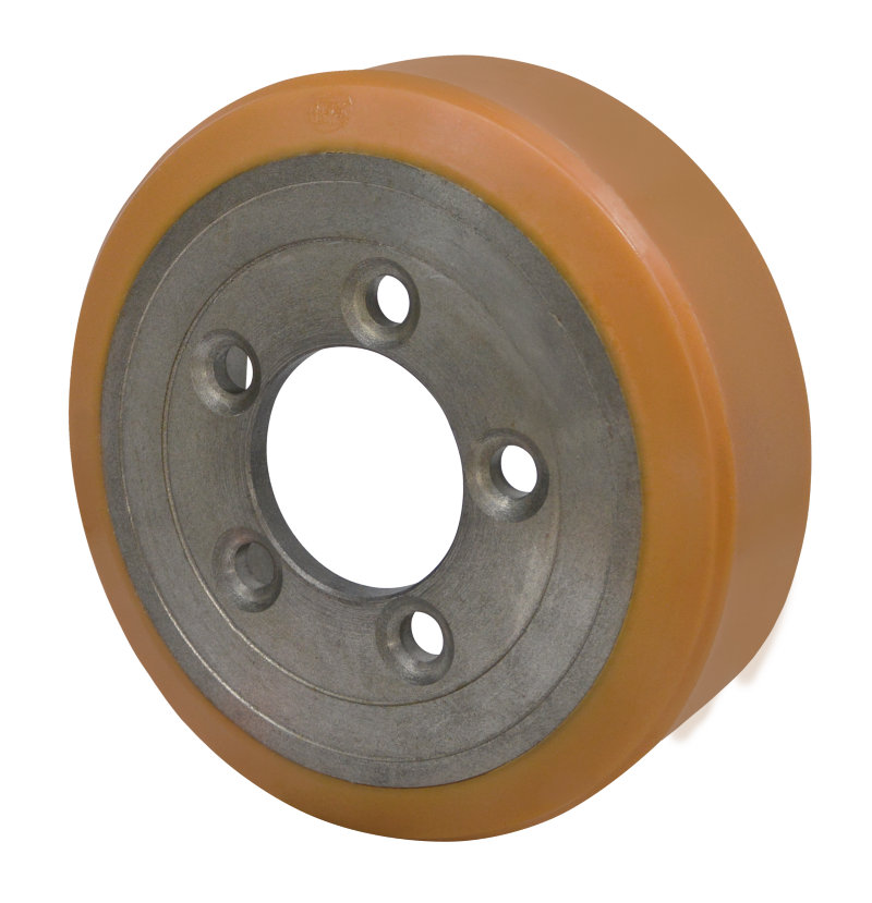 Aandrijfwielen met een Polyurethaan bandage (ca 92 Shore A), gevulkaniseerd op een gietijzerenvelg met flensaansluiting.