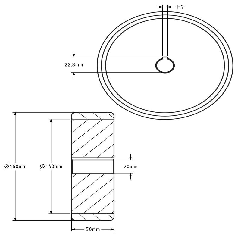 Polyurethaan aandrijfwiel 160x50 mm - Boring 20 H7 spiebaan - 800 kg