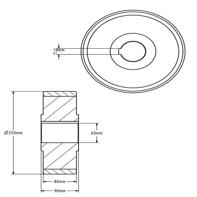 Polyurethaan aandrijfwiel 250x80 mm - Boring 60 mm H7 spiebaan - 1800 kg