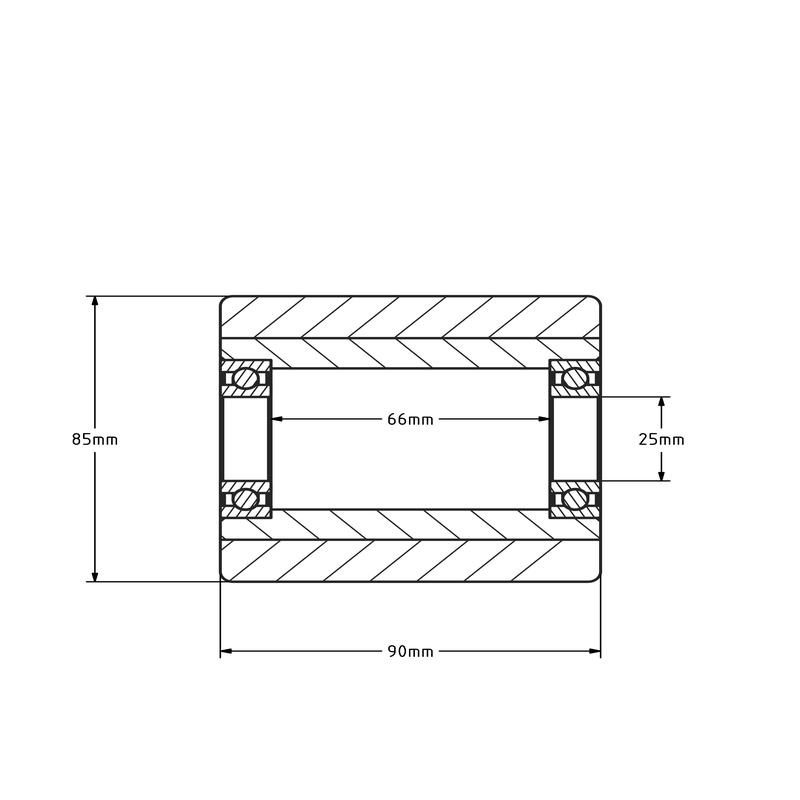 Palletrollen met een polyurethaan band (ca 92Shore A), gevulkaniseerd op een stalenkern met kogellagers.