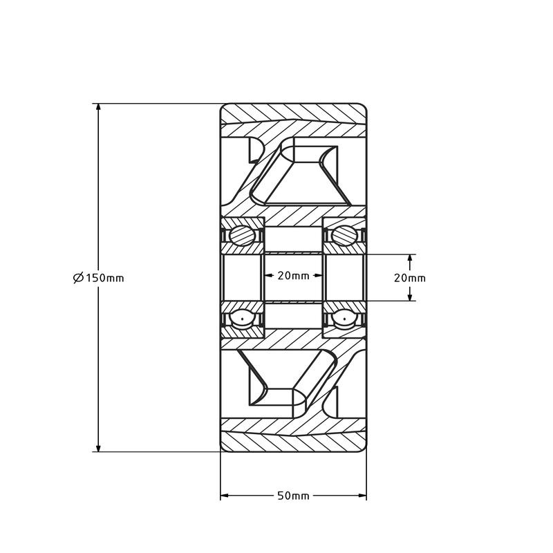 PU wiel 150 mm met kogellager asgat 20 mm - 700 kg