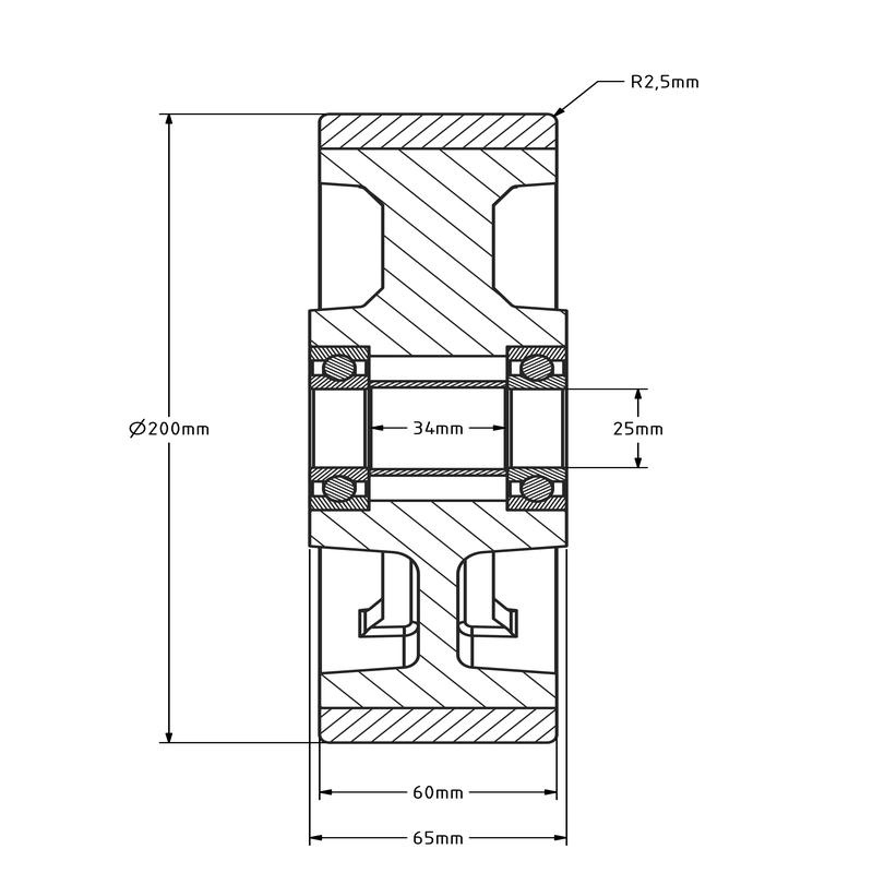 PU wiel 200 mm met kogellager asgat 25 mm - 1200 kg