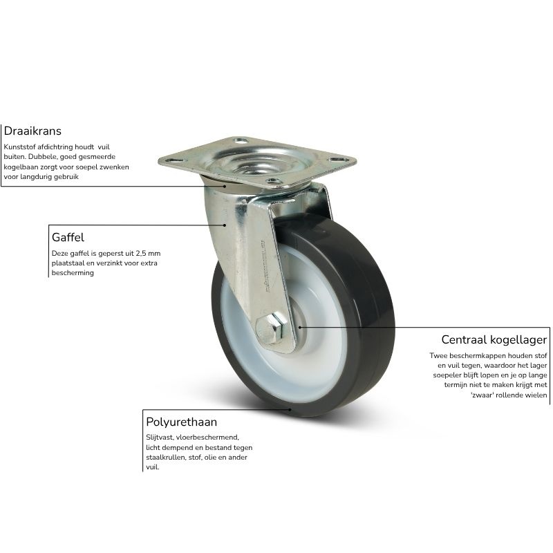 Het loopvlak is gemaakt van polyurethaan (PU). Dit is de beste allround keuze voor dagelijks gebruik. PU rijdt goed in omgevingen met stof, vuil en staalkrullen. Het loopvlak raakt daarbij minder snel beschadigd dan rubber. Daarnaast heeft PU weinig weerstand bij het opstarten en rollen. Het materiaal is hard zoals nylon, maar heeft een lichte demping zoals bij rubber. Het zwenkwiel 125 mm heeft een hoog draagvermogen en goede roleigenschappen heeft.