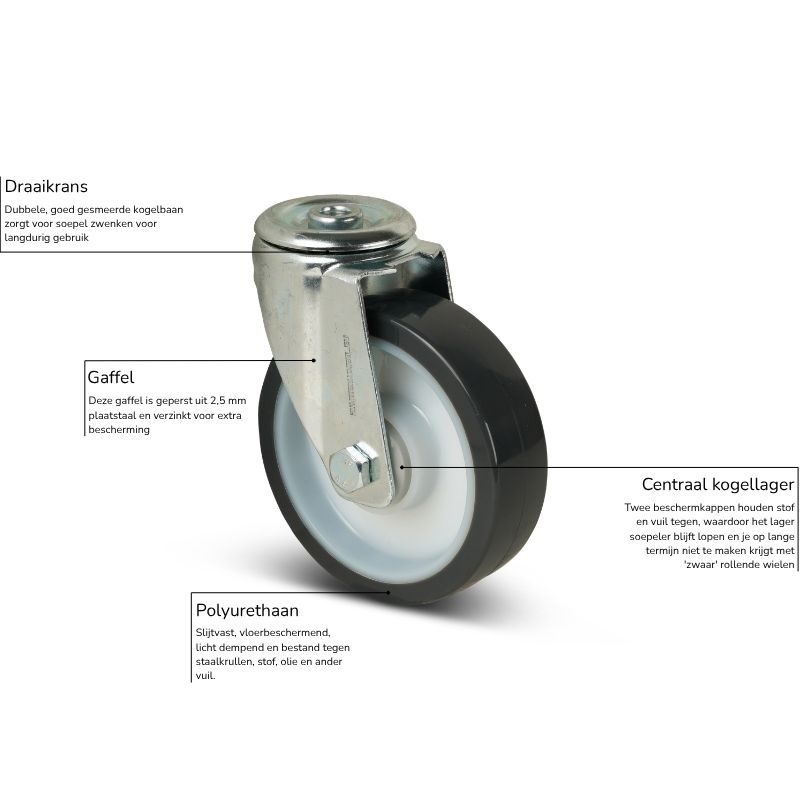 In het wiel zit één centraal kogellager dat aan beide zijden is afgesloten met kunststof kappen. Deze afscherming helpt om stof en vuil buiten het lager te houden. Daardoor blijft het lager soepel lopen en voorkom je op langere termijn dat de wielen “zwaar” gaan rollen. Om die reden wordt het zwenkwiel 125 mm vaak toegepast in werkplaatsen en magazijnen, waar stof en losliggend vuil bijna niet te vermijden zijn.