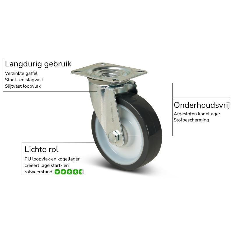 PU zwenkwiel 125 mm met kogellager en plaat - 200 kg