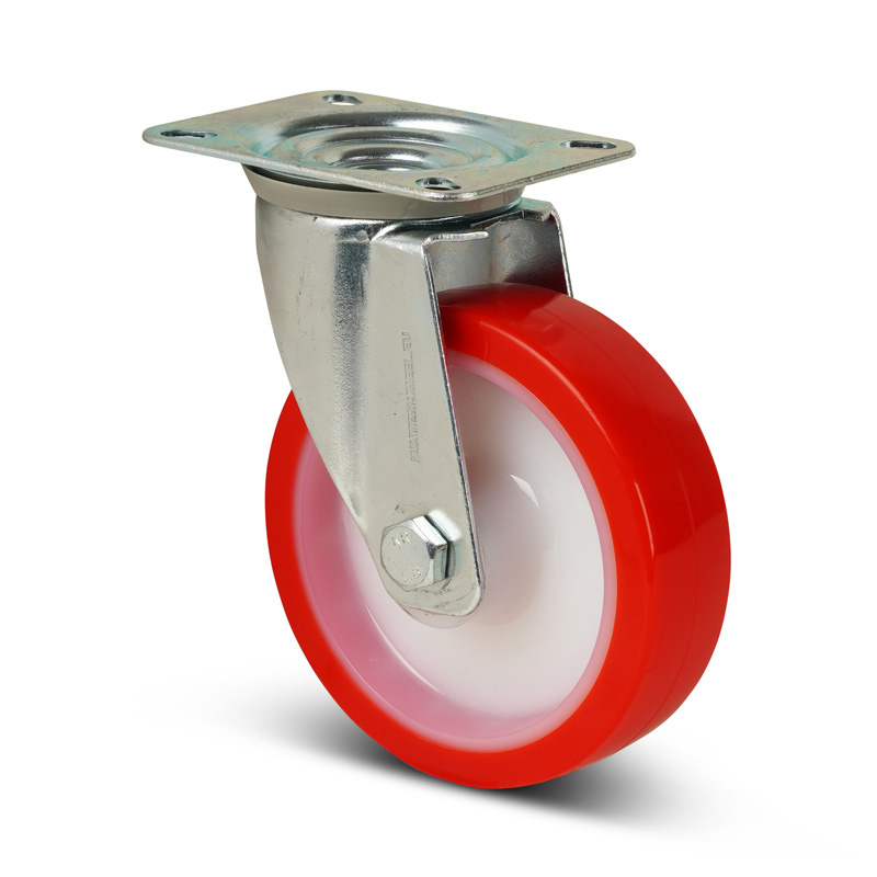 Wielen met een rode polyurethaan band (ca 95 Shore A), geïnjecteerd op een witte polyamidevelg met rollager.