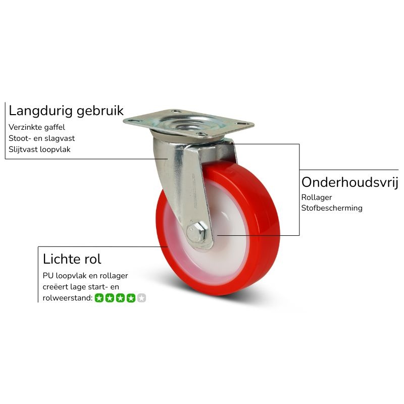 Wielen met een rode polyurethaan band (ca 95 Shore A), geïnjecteerd op een witte polyamidevelg met rollager.