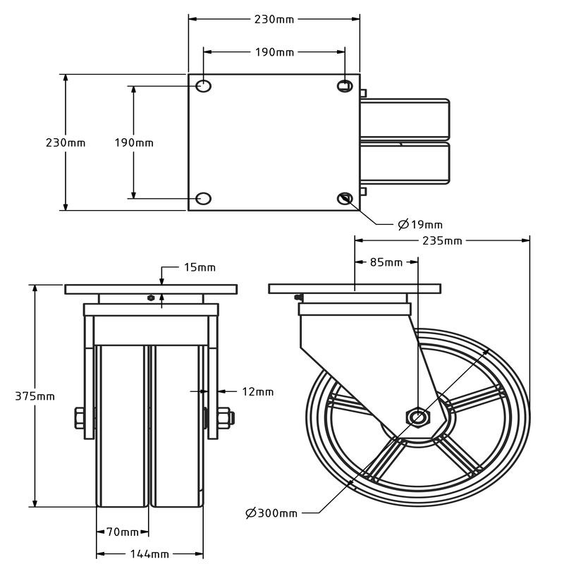 PU zwaarlast zwenkwiel 300 mm - 4.000 kg