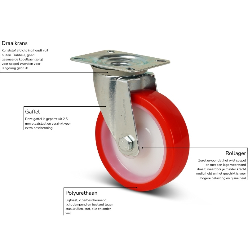Het PU zwenkwiel is voorzien van een rollager, wat zorgt voor een soepele en stille werking. De zwenkplaat is gemaakt van robuust staal en heeft vier bevestigingsgaten om het wiel stevig op zijn plaats te houden. Het wiel heeft een maximale belastbaarheid van 130 kg, waardoor het geschikt is voor het verplaatsen van middelzware lasten. Dit PU zwenkwiel is verkrijgbaar als individueel wiel, maar kan ook worden gecombineerd met andere zwenkwielen, (met rem) of bokwielen om een stevig en wendbaar transportmiddel te creëren.
