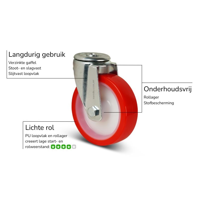 PU zwenkwiel 80 mm met boutgatbevestiging - 150 kg