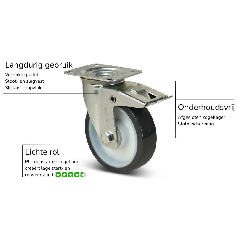 PU zwenkwiel met rem 100 mm met kogellager en plaat - 150 kg