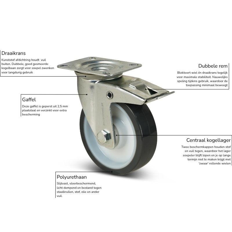 Het loopvlak is gemaakt van polyurethaan (PU). Dit materiaal is sterk en blijft goed rijden in omgevingen met stof, vuil en staalkrullen. De band is slijtvast en is ongevoelig voor beschadigingen. Daarnaast rolt PU soepel en is het stevig bij stoten en kleine drempels. PU is hard zoals nylon, maar combineert de demping van rubber. Daardoor heeft het zwenkwiel met rem 125 mm een hoog draagvermogen met vriendelijke roleigenschappen.