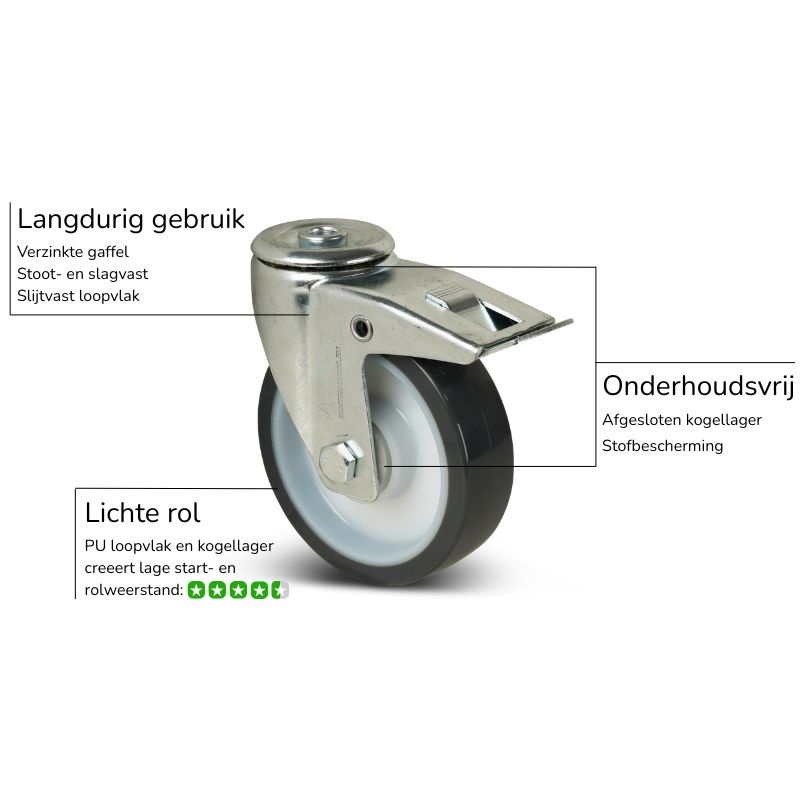 PU zwenkwiel 125 mm met rem en boutgat - 200 kg
