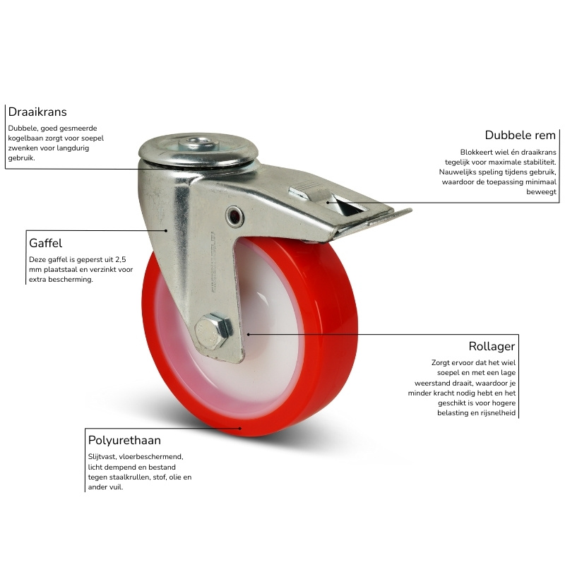 PU zwenkwiel met rem 200 mm met boutgatbevestiging - 400 kg