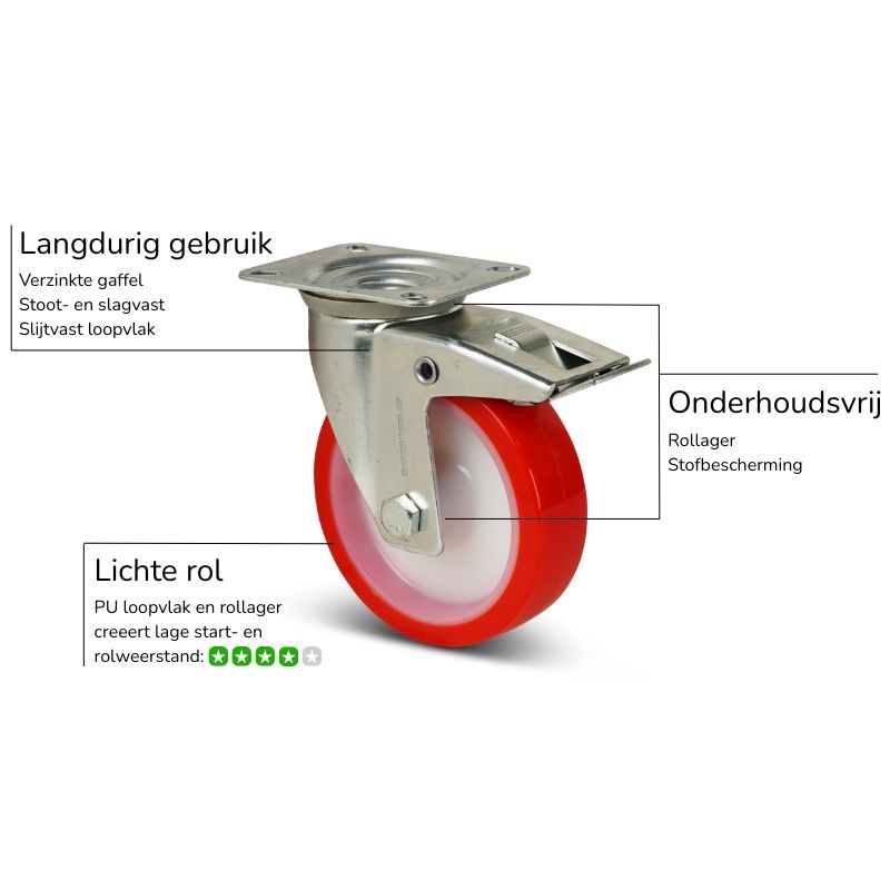 PU zwenkwiel 80 mm met rem en plaat - 130 kg