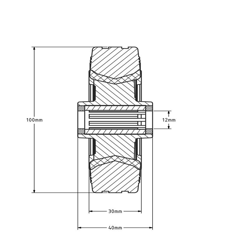 Rubber wiel 100 mm met rollager asgat 12 mm - 70 kg