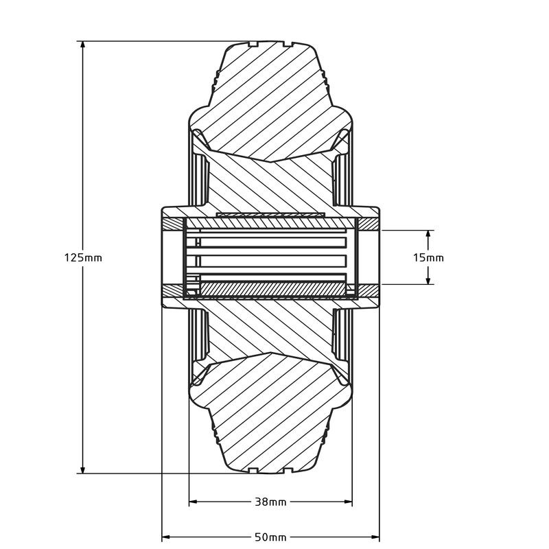 Rubber wiel 125 mm - rollager asgat 15 mm - 100 kg