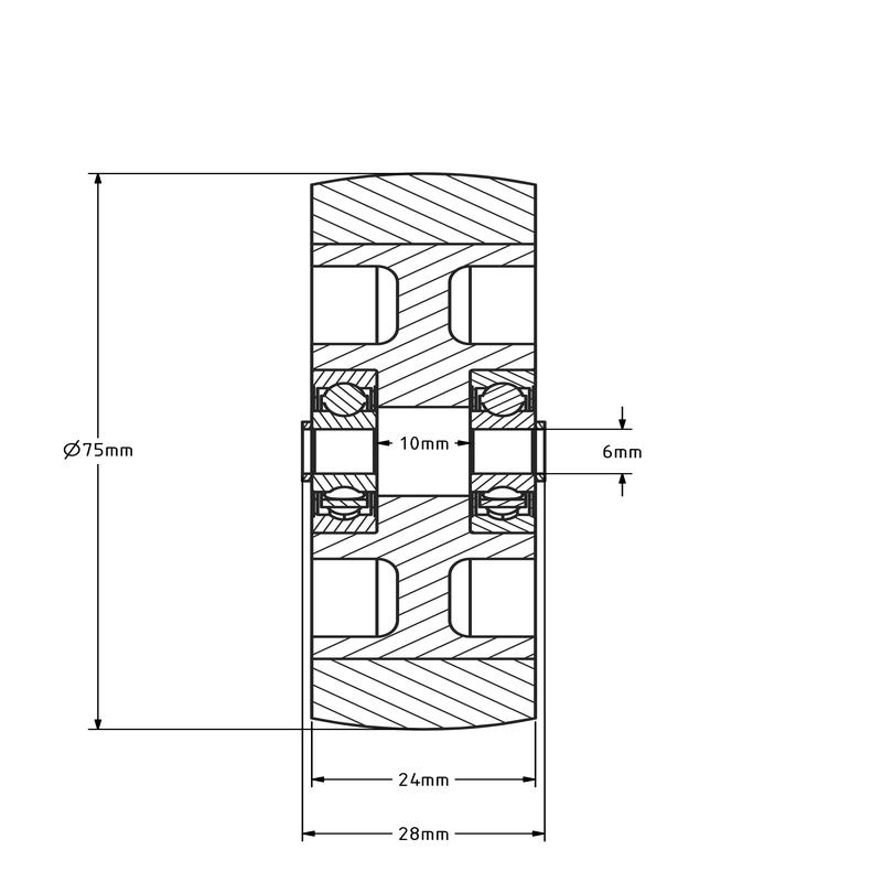 Rubber wiel 75 mm - kogellager asgat 6 mm - 75 kg
