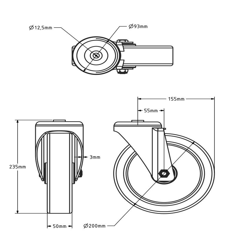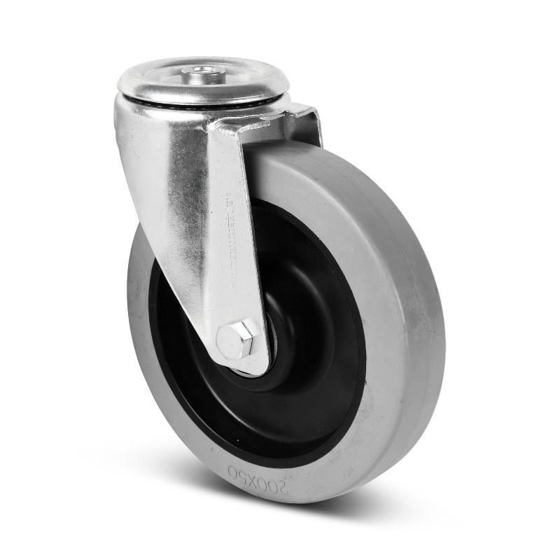 Rubber zwenkwiel 200 mm met boutgatbevestiging - 400 kg