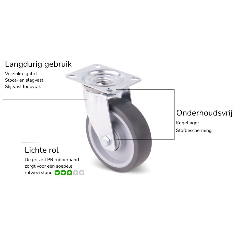 Rubber zwenkwiel 80 mm met plaat - 80 kg