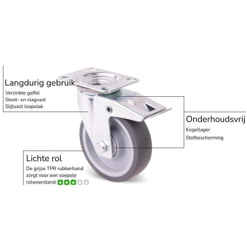 Rubber zwenkwiel met rem 125 mm - kogellager - 100 kg