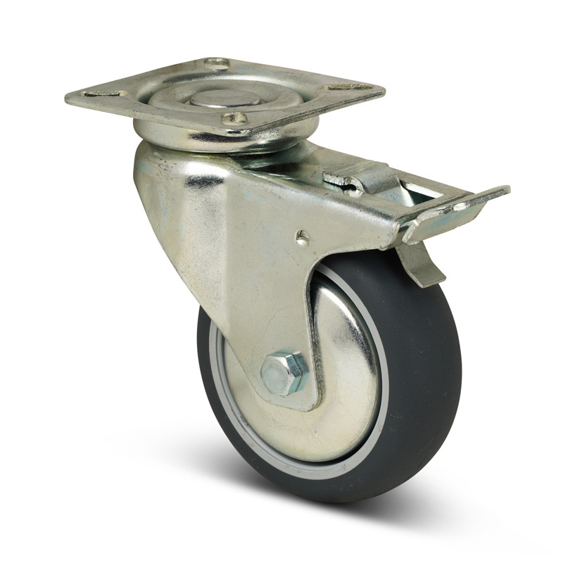 Wielen met een grijze tpr rubberband (non marking), geïnjecteerd op een kunststofvelg met kogellager en staal verzinkte wielkappen.