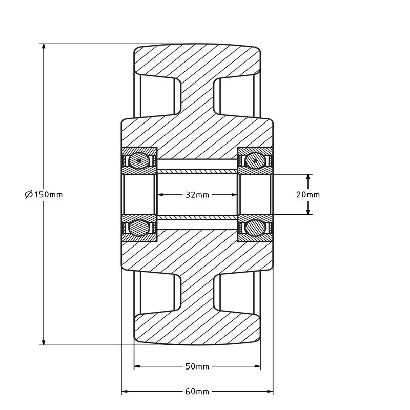 Nylon wiel 150 mm met rvs kogellager asgat 20 mm - 800 kg