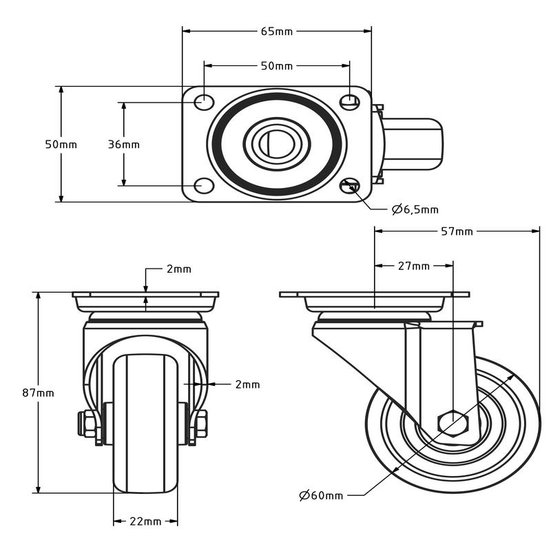 Rvs zwenkwiel 60 mm - Rubber - 40 kg