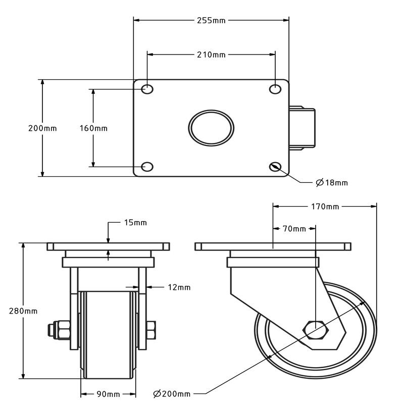 Zwaarlast zwenkwiel 200 mm met stalen wiel - 6000 kg