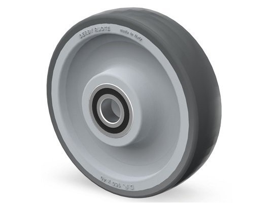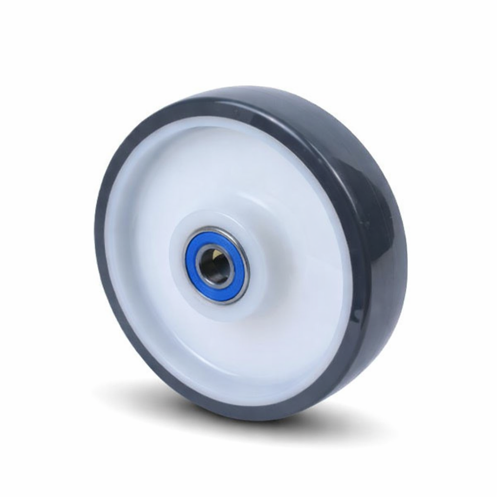 Wielen met een grijze polyurethaan bandage (ca 80 Shore A), geïnjecteerd op een witte polyamide velg met kogellagers.