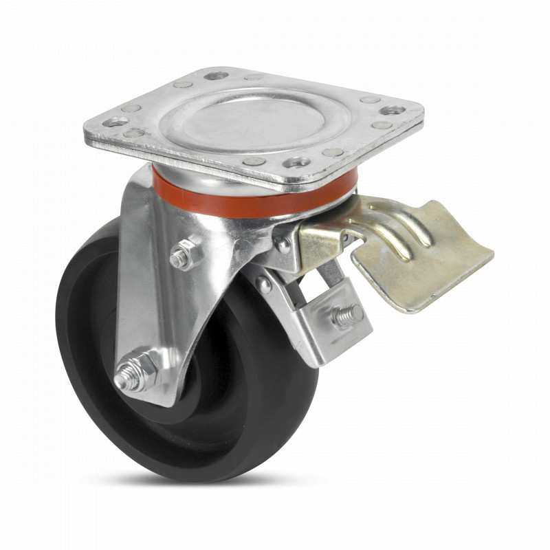 Het polyamide wiel functioneert goed op vlakke betonnen vloeren met weinig vuil. Voor ondergronden met vuil of ruwe oppervlakken is polyurethaan beter geschikt. Polyamide is hard en heeft op schone, vlakke vloeren een lage rolweerstand. Op ruwe ondergronden kunnen meer trillingen en geluid ontstaan. Polyamide is zeer slijt- en slagvast. De versterkte 8 mm dikke zwenkkrans is goed gesmeerd en kan via de smeernippel opnieuw gesmeerd worden. De verdikte draaikrans is bijna volledig afgesloten en heeft een rode stofring als extra bescherming tegen stof en vuil.