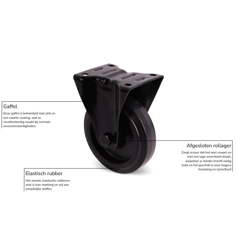 Dit bokwiel heeft dynamisch draagvermogen van 200 kg. Uitgerust met een rollager en asbus, biedt het wiel een spanningsvrije werking en minimaliseert het de rolweerstand. De bokgaffel heeft een plaatbevestiging van 102x87 mm en een boutgatafstand van 80x60 mm met een montagediameter van Ø 9 mm. De industriële uitstraling van het zwarte bokwiel maakt het een uitstekende keuze voor toepassingen zoals werkbanken, transportkarren, buitenkeukens en bbq’s. De verzinkte gaffel in combinatie met de zwarte gelakte laag biedt uitstekende weersbestendigheid. Het bokwiel wordt veel toegepast in combinatie zwenkwielen, wat resulteert in een toepassing die minder wendbaar is. Deze verminderde wendbaarheid zorgt voor betere controle en stabiliteit, tijdens het verrijden van toepassingen over lange afstanden.